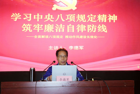 為深入學習貫徹中央八項規定(dìng)精神,進一步強化黨員幹部(bù)職工的(de)紀(jì)律意識和規矩意(yì)識,推動作風建設常態化、長效化,4月(yuè)15日,公司黨(dǎng)委書記、董事長李德軍以“學習中央八項規定精神 築牢廉潔自律防線——全麵解(jiě)讀八項規定 推動作風建設長效化”為主題,在職工會堂為全(quán)體黨員(yuán)、入黨積極分子講授專題黨課。